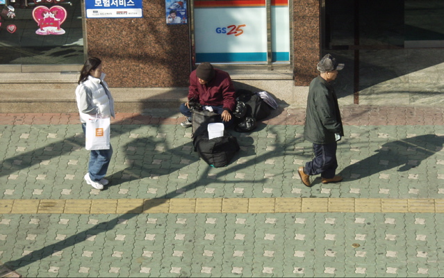촬영은 연출이 아닌 촬영은 순간포착이 힘듭니다. 노숙자가 입으로 음식 가져가는 순간에 행인이 없고,